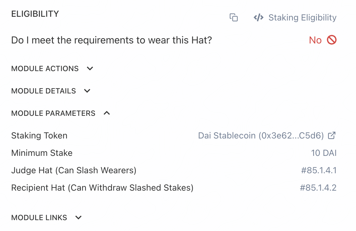 The staking eligibility module requires an account to stake a minimum amount of tokens (like ETH, reputation points, or DAO tokens) in order to hold a given role and access its associated powers. If that address un-stakes their tokens, or their stake is slashed by a designated judge, their hat is automatically revoked.