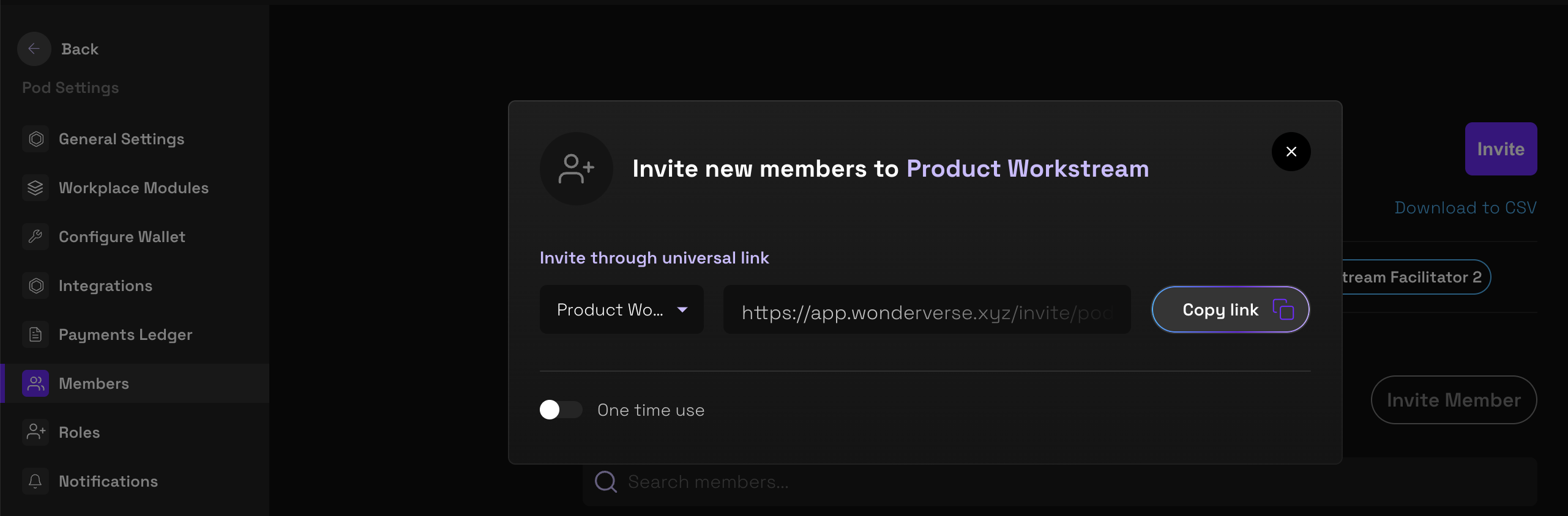 To invite people to join your Wonderverse using the token gate you created, select **Members** in the lefthand navigation, select **Invite**, and **select the role you created above** using the dropdown menu. **Copy the link found here**: this is the link you will use to invite addresses to join Wonderverse  and receive the specified role and associated authorities.