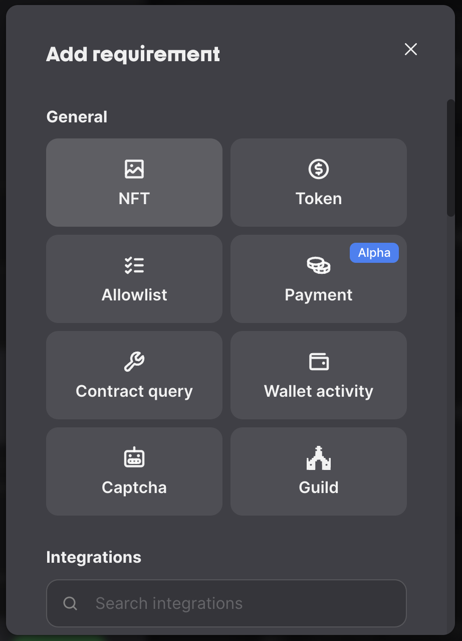 At Guild.xyz, for example, which provides token-gating for Discord, Telegram, Github, and Google Workspace, you will create a role within your Guild, provide that Guild role with specific "rewards" (aka permissions), and then add a requirement that an address must have possession of a particular NFT to hold that Guild role.